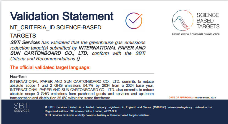 SBTi Services has validated that the greenhouse gas emissions reduction target(s) submitted by INTERNATIONAL PAPER AND SUN CARTONBOARD CO., LTD. conform with the SBTi Criteria and Recommendations